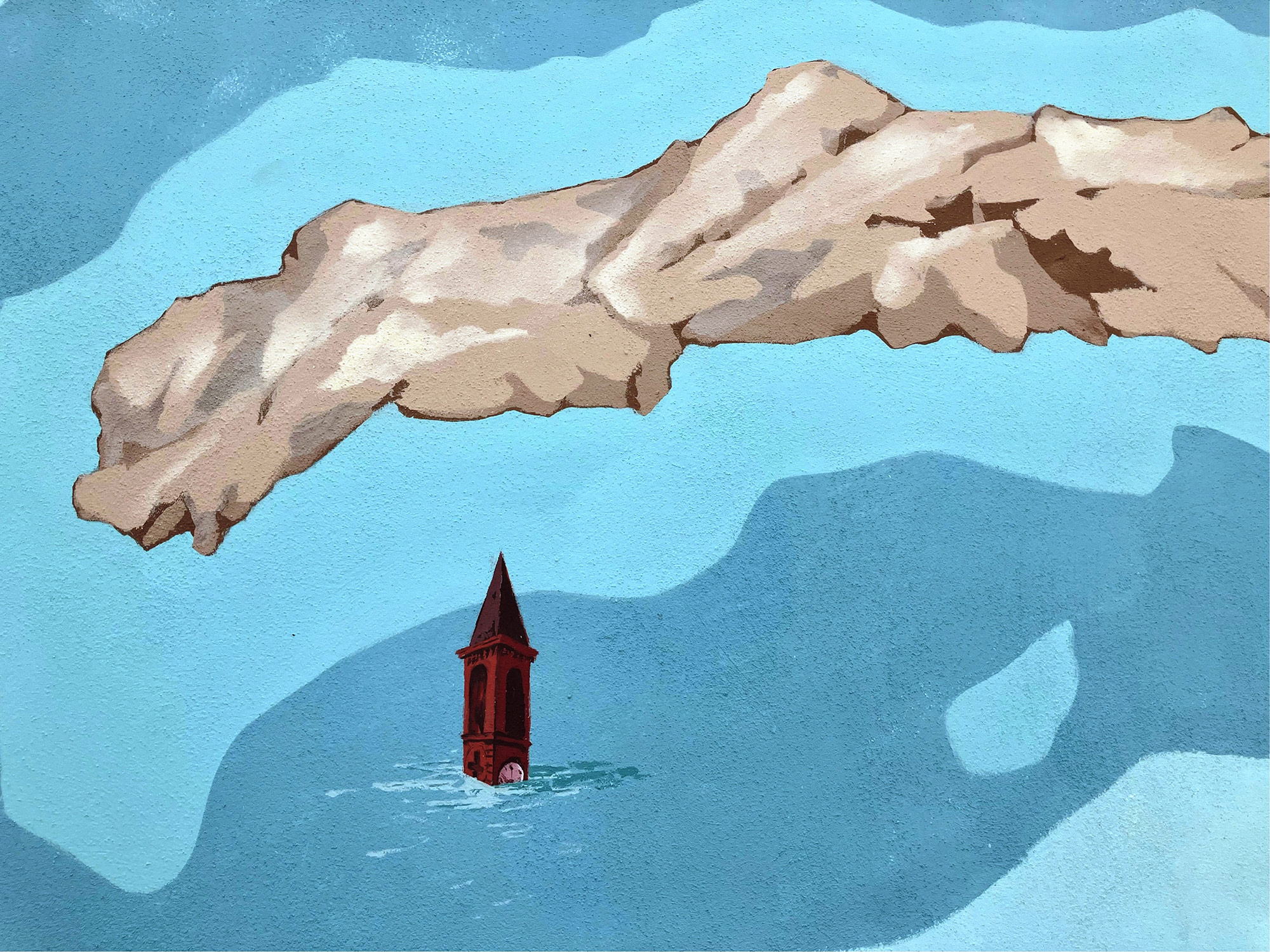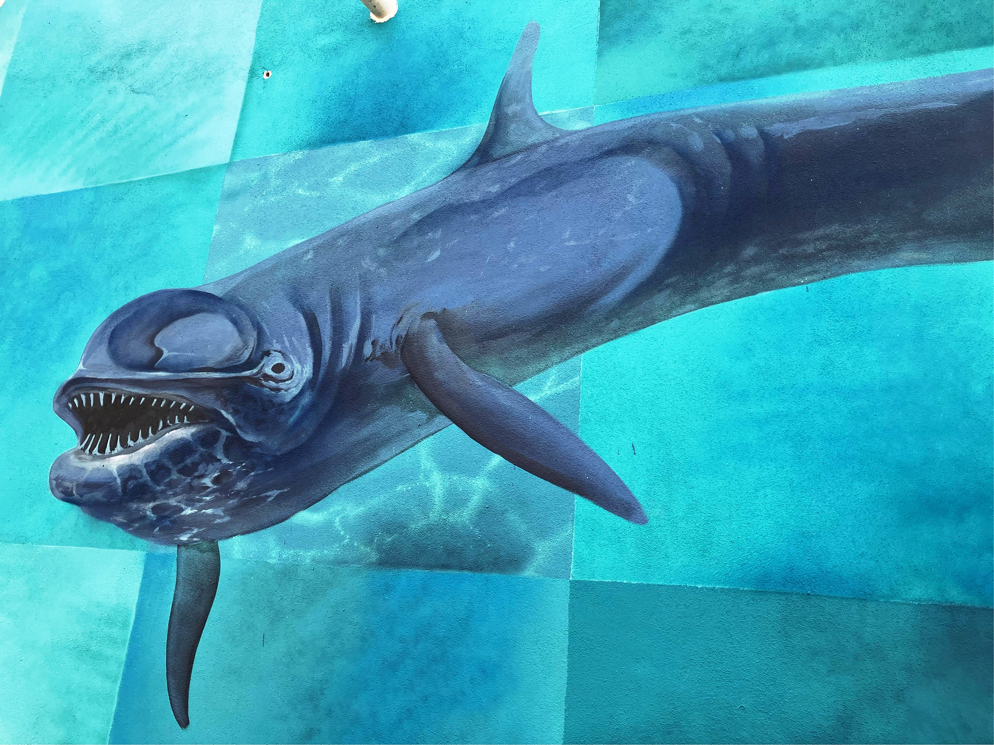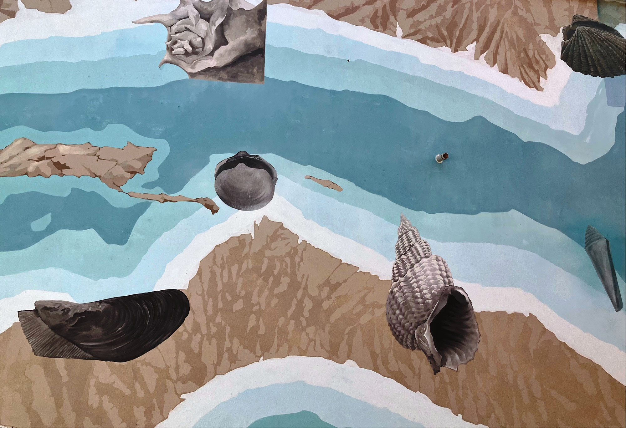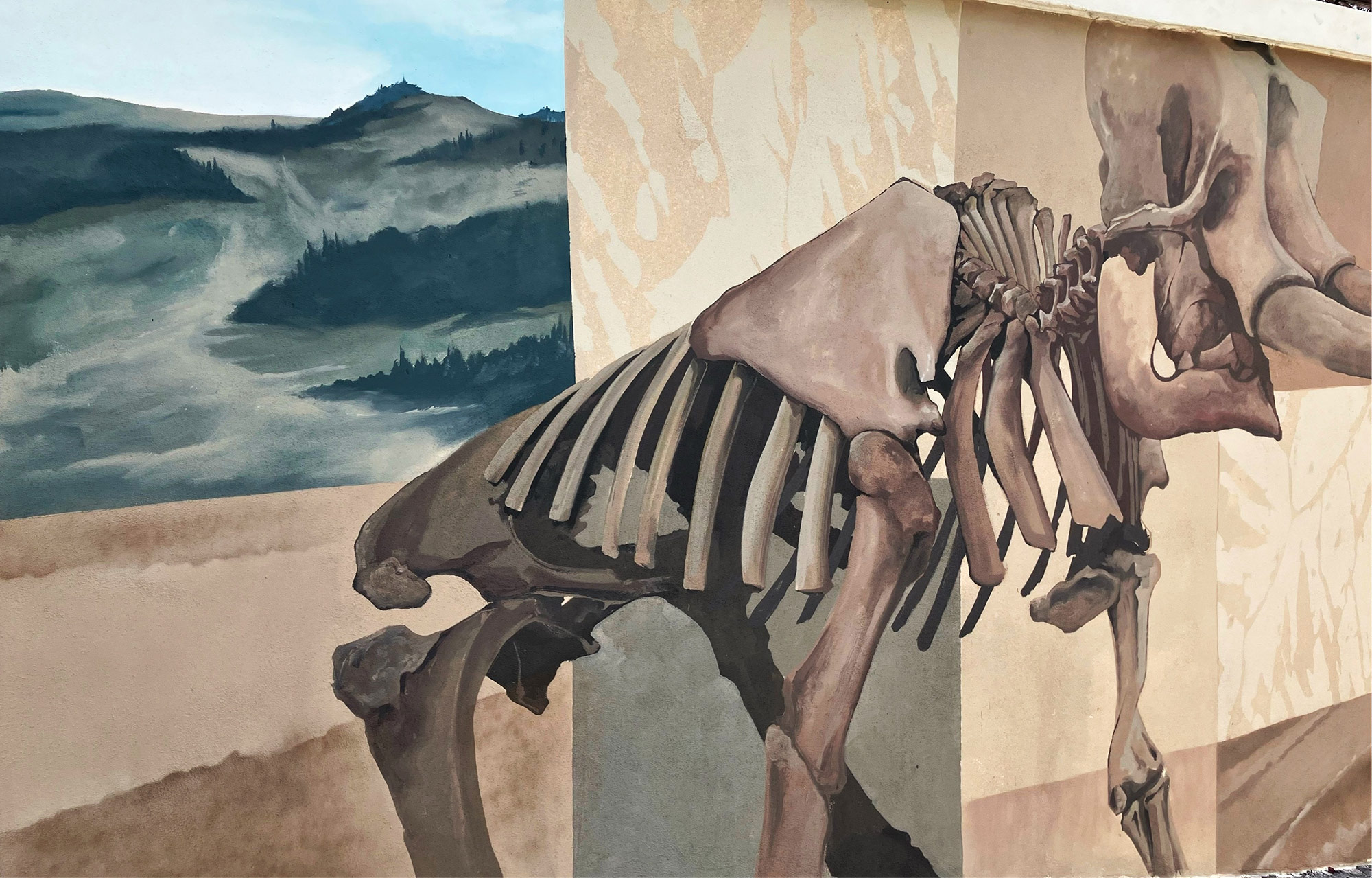 Il muro dipinto è come un libro aperto di storia: a ogni passo che fai è come se girassi la pagina. Un passo e trovi la balena e il delfino preistorico, un altro ed entri nel mondo delle conchiglie. Fino a quando t’imbatti nel mastodonte. Ma già l’acqua marina si è ritirata, facendo intendere la terra: spunta un campanile e comprendi che, tra un po’, saranno colline piene di fossili e quel pugno di case che si chiama Valleandona.