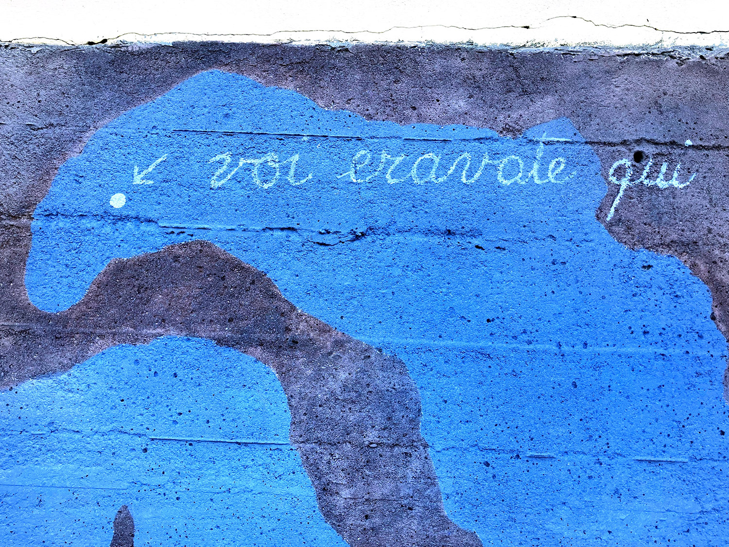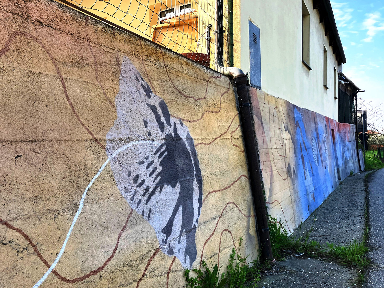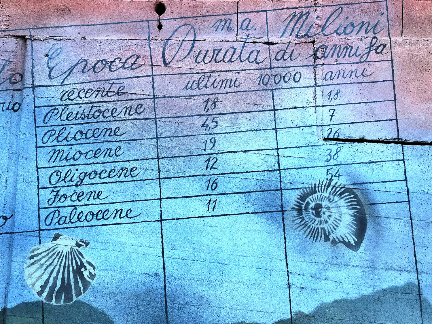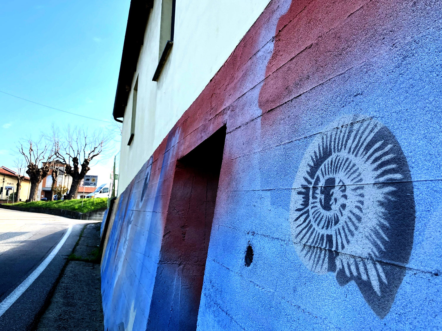Giallo come il sole, un vestito d’estate, le sabbie di collina intrise di conchiglie. Azzurro come il fiordaliso che non si trova, gli occhi di una madre, l’antico mare. Il murale è un libro aperto su una storia di milioni di anni che ci appartiene: mare, palude, terraferma, colline. Le nostre.