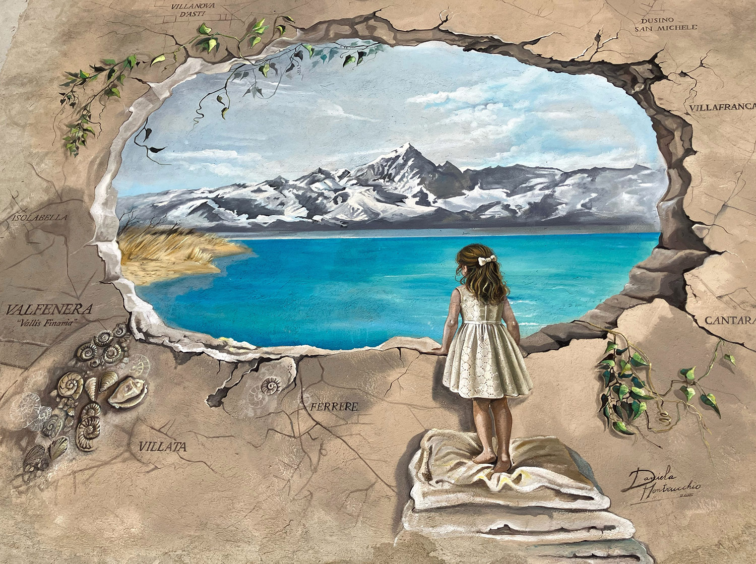 Passato e presente s’incontrano nello sguardo di una bimba: limpida è l’acqua dell’antico mare e lieve la coltre bianca della montagna. Sorprendentemente il Golfo Padano convive con la Terra. La bambina è spettatrice privilegiata della congiunzione tra il tempo perduto e quello presente.