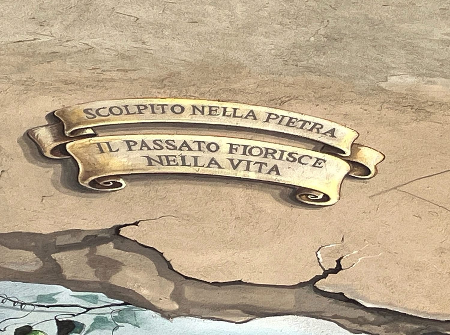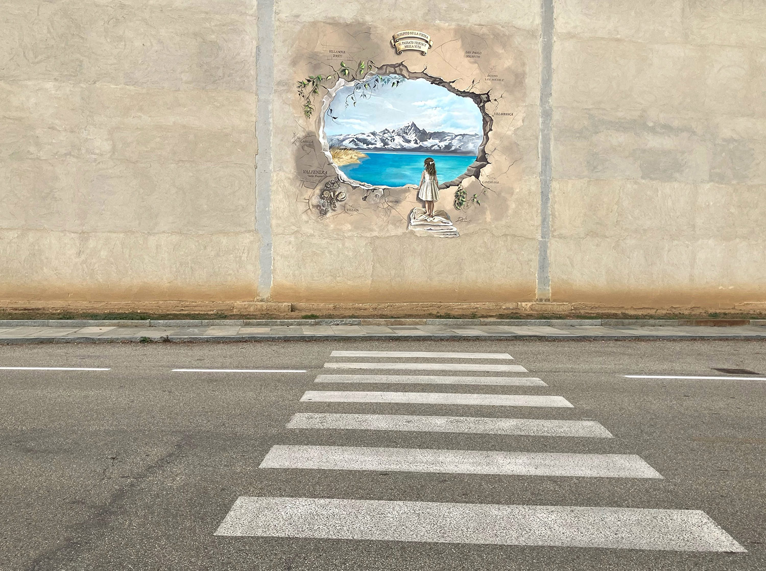 Prima che fosse costruito il grande capannone su cui campeggia il murale, gli abitanti di via San Michele si godevano la vista del Monviso. L’artista riprende lo spezzone di quella visione e recupera altre memorie della tradizione valfenerese, come il lavoro delle donne nelle filande in cui si tesseva la seta.